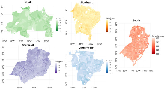 The overall average of the municipalities is 0.7891 (value without outliers and with confidence bias), which is different from the regional averages of the eco-efficiency index of the north (0.7839), northeast (0.9067), center-west (0.8348), southeast (0.6802), and south (0.7526) regions. An interesting point of the regional averages is that the northeast region presents, on average, higher score values than all regions, which shows that the region, despite having few eco-efficient municipalities, is closer to the productive frontier compared to other regions; this shows a greater homogeneity between the areas of agricultural activity in the region.