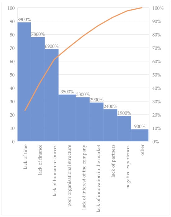 The investigated problem is the unused innovation opportunities of enterprises. Companies indicated the factors that cause the non-use of innovation opportunities in their company. The answers are shown in the Figure 1. The left axis shows the number of companies that identified the given factor as the cause of unused innovation opportunities. The cumulative number of responses is expressed on the right axis, which indicates the strength of some factors compared to others. Based on the above information, the most significant factor causing the non-use of innovation opportunities by companies is a lack of time. In this area, it is subsequently possible to divide this problem into smaller problems and determine where the given lack of time arises. In the position of an employee or working hours, the time fund can be adjusted by dividing tasks and examining work tasks. When looking at the length of innovation development, this factor represents a separate part of the process. The second most frequently cited factor is a lack of funds, followed by a lack of human resources. In this case, human resources can again be perceived as the expertise of employees, their number, or their time commitment.