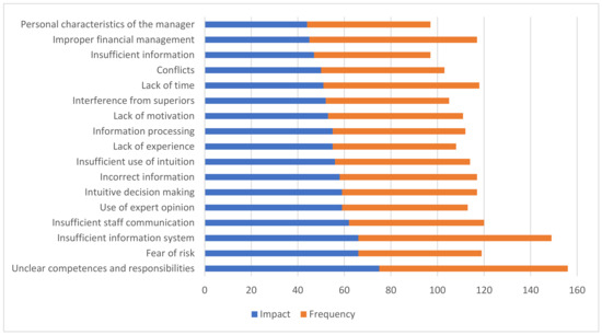 The causes of decision errors in the innovation process at the companies were also investigated. For the above errors, respondents commented on the impact of the error on the enterprise in the form: minimum impact, medium impact, maximum impact, and on the frequency of occurrence of the error in the form: rarely, moderately often, often. The Figure 2 shows the reasons, comparing the impact and frequency.