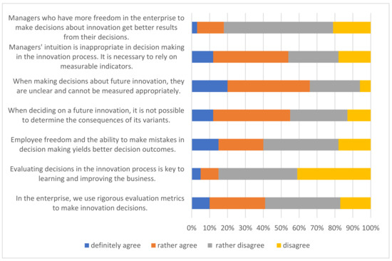 Part of the research was also the expression of the degree of agreement or disagreement with the determined research questions and statements describing decision-making about the innovation process in the company. The results are presented in the Figure 3. The respondents took the most agreeable position towards the statement that the evaluation of decisions in the innovation process is crucial for learning and improving the company. Up to 40% of respondents strongly agreed with this statement, while another 45% of respondents rather agreed with the statement. With this statement, it is important to remember that the respondents who agreed that the evaluation of decisions is crucial for learning and improving the company subsequently indicated the company’s negative approaches to evaluation metrics, or other ways of evaluating and working with information in the other questions of the questionnaire. Respondents also expressed their agreement with the statement in the wording: managers who have more freedom in the company when deciding on innovations achieve better results from their decisions. Together with the results of other questions, it can be said that excessive control by superiors or partner companies is perceived negatively by the respondents; however, it is necessary to follow certain frameworks of the innovation process and measure the results. This topic was also investigated with the claim that managers’ intuition is inappropriate when making decisions in the innovation process and that it is necessary to rely on measurable indicators. Despite a slight predominance of negative statements, opinions on this issue were evenly divided between agreeing and disagreeing. From the point of view of further research, it is possible to compare other respondents’ answers on the basis of these questions and thus better describe the sample set of enterprises.