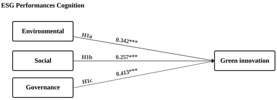 H1. ESG performance cognition has a positive (+) effect on green innovation. Hypothesis 1a: E in ESG performance cognition has a positive (+) effect on green innovation. (β = 0.342, t = 5.550, p < 0.001), thereby supporting Hypothesis 1a. Hypothesis 1b: S in ESG performance cognition has a positive (+) effect on green innovation. (β = 0.257, t = 4.556, p < 0.001), thereby supporting Hypothesis 1b. Hypothesis 1c: G in ESG performance cognition has a positive (+) effect on green innovation. (β = 0.413, t = 6.790, p < 0.001), thereby supporting Hypothesis 1c. This result shows that from an economic perspective, companies that improve employees’ awareness of ESG performance not only help improve environmental and social values but also enhance green innovation and bring sustainable development value and future economic benefits to the company.