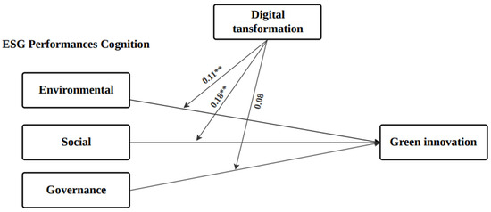 Secondly, by introducing the concept of digital transformation, we have injected new theoretical elements into the field of ESG research. Digital transformation is not just a technological change but an all-encompassing transformation affecting organizational culture, decision-making, and employee interaction [71]. From this theoretical perspective, we focus on the correlation between ESG performance cognition and green innovation and turn our attention to how digital transformation influences this relationship. Therefore, this study provides a broader space for future theoretical construction in the ESG domain, inspiring researchers to contemplate corporate sustainable development in the digital age deeply.