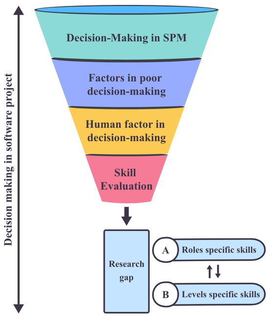 The related work specific to decision making in software projects is described in this section, as illustrated in Figure 1. Initially, overall decision making in SPM with existing decision-making models is presented. Next, we examine the literature regarding the impact factors of poor decision making. The literature search was continued to extract the factors that could be controlled externally. The skill resource factor was explored further to reveal existing studies in skills evaluation. The limited availability of skill evaluation to assist decision making was discovered, as no studies have focused on skills related to role-based levels.