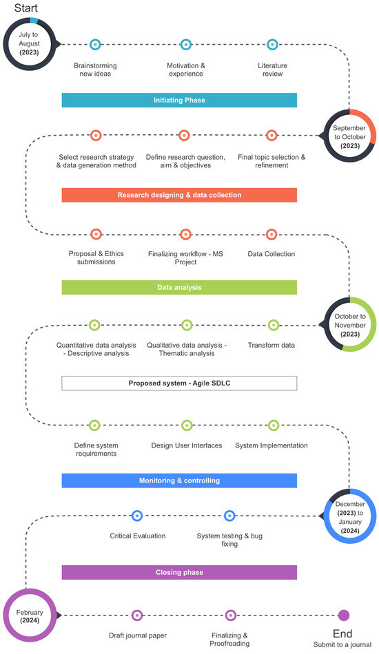 This research used both qualitative and quantitative data, which is identified as a mixed method in the literature [60]. The Agile System Development Life Cycle (SDLC) was followed as the research process model, as shown in Figure 2. Initially, the datasets of web developers were analysed, and later, the same methodology was followed for the other two roles. Research processes are not straightforward in practical scenarios, as discussed in the literature. Furthermore, this is a flexible methodology that provides an opportunity to work on backward and forward phases [61]. For example, the application development was performed iteratively as it used analysed data such as mean, average, majors, minors, etc. Therefore, the overall process was treated as an iterative process.