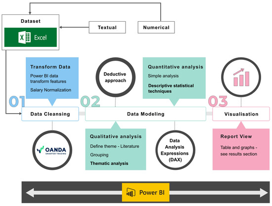 The data analysis was conducted for both qualitative and quantitative data. Numeric data were statistically analysed, such as salary and experience [61]. For example, the count of each skill was calculated to identify the frequency of the skills. Objective 1 was achieved by applying mixed methods and the salary and experience from each data point (job advertisement) used in the rest of the objectives with analysed data from objective 1. However, salary and experience were not available in every data point and data that existed was used for analysis. Microsoft Power BI Desktop (version 9.6) was used to analyse the data [68]. Figure 3 illustrates the overall data analysis process, which is described in each sub-section.
