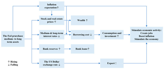 After the 2008 financial crisis, in an attempt to combat what was emerging as the most severe recession since 1937–1938, the Federal Open Market Committee (FOMC) lowered the federal funds rate to almost zero, as described by Blinder [1]. As a result, the Federal Reserve began implementing QE policies, which involved the purchasing of long-term bonds through the creation of new money. This move aimed to increase the prices of long-term bonds and lower interest rates, thereby reducing mortgage rates and supporting the real estate market [2]. According to CBC [4], QE can support asset prices. Through asset price increases, the economy is boosted, such as through the direct purchasing of medium- and long-term assets from the private sector, setting purchase targets to directly affect medium- and long-term interest rates (and real interest rates), as well as through inflation expectation channels, wealth channels, credit channels, and exchange rate channels, etc., to convey the effect of monetary policy. Therefore, stock prices and movable property prices also rise to drive economic efficiency.