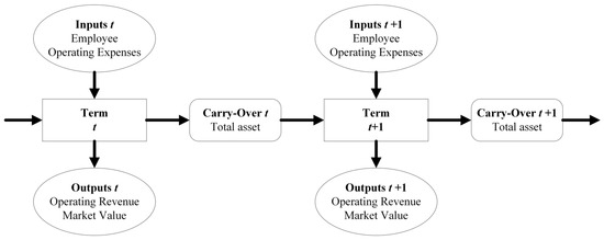 The definitions of the variables used in the dynamic structure are described in Table 2. This study was a compilation of previous research works that measured the efficiency of the real estate industry in a country using the DEA method. It has been observed that many studies in the literature have used operating expenses and the number of employees as inputs, the operating revenue as output, and the total assets as a carryover variable. The aggregation of individual variables used in previous research is summarized in Table 2. Furthermore, based on our knowledge, there are no existing research works that have used the DEA method with the market value as the output to measure the efficiency of the real estate industry. Therefore, this study collected research works that measure other industries as a basis for adopting market value as the output. The relevant literature is also summarized in Table 2.