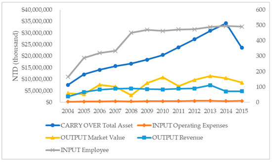 The average data for each company can be found in Figure 4, in which the indicators of various input and output variables show an upward trend from 2004 to 2015. In particular, the indicator of total assets shows a high growth trend. This helps us to further understand the upward development of construction companies over the course of this 12-year period, and we observed that the total assets increased significantly after the implementation of QE in 2010.