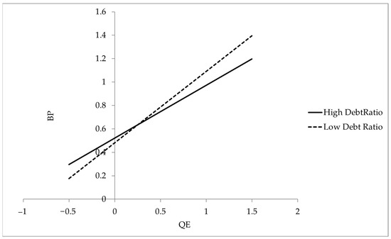 Following the research of Kuo, Lu, and Ganbaatar [59], we applied hierarchical regression to test the effect of QE on BP. Then, we examined the moderating role of the debt ratio on the relationship using the regression.