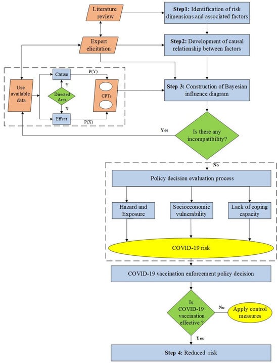 The proposed approach is theoretically based on Bayesian Influence Diagrams (BIDs), which can be used to model and assess uncertainties within a networked environment [53,54]. Although BIDs have been utilized across various areas in pandemic risk analysis, their application has been limited to exploring focused problems such as analyzing vaccine uptake by enforcing policy decisions. In this regard, leveraging BIDs to explore the complexity associated with the multidimensional nature of the COVID-19 pandemic risk on vaccination uptake decisions is imperative. The evaluation strategy of this study consists of four steps, as presented in Figure 1. It was applied to four provinces of Pakistan, namely, Punjab, Sindh, Baluchistan, and KPK, to assess the effectiveness of COVID-19 vaccination enforcement policy decisions in each region.