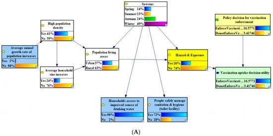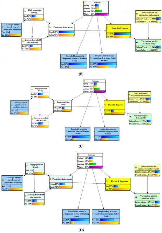 The BID model’s results regarding hazard and exposure in four provinces (Punjab, Sindh, KPK, Balochistan) of Pakistan are presented in Figure 2A–D, illustrating the contextual relationships among nine risk factors. The results reveal the interconnections among these factors. Specifically, the analysis demonstrates that the average annual growth rate of the population directly impacts the population density. Furthermore, population density directly influences the average household size and the population distribution between rural and urban areas. These demographic factors, in turn, exhibit a direct relationship with hazard and exposure, exerting an indirect influence on the decision utility related to vaccination uptake. Additional findings highlight the significance of households’ access to an improved source of drinking water and the effective management of sanitation and hygiene by the populace. These two factors contribute to environmental considerations. The environmental factor emerges as critical due to its impact on the population residing in rural and urban areas and its influence on hazard and exposure. The intricate web of these nine factors collectively affects the decision utility associated with vaccination uptake.