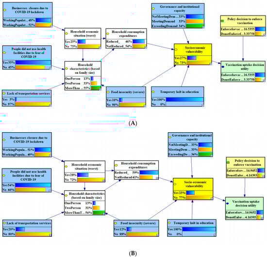 Moreover, food insecurity is directly linked to household characteristics and contributes to socio-economic vulnerability, influencing vaccine uptake decisions. Furthermore, temporary halts in education and weakness in the governance system and institutional capacity are identified as direct contributors to socio-economic vulnerability and indirectly influence vaccine uptake decision utility. Understanding these interconnected relationships is crucial for designing targeted interventions to address socio-economic vulnerabilities and enhance vaccine uptake in affected populations.