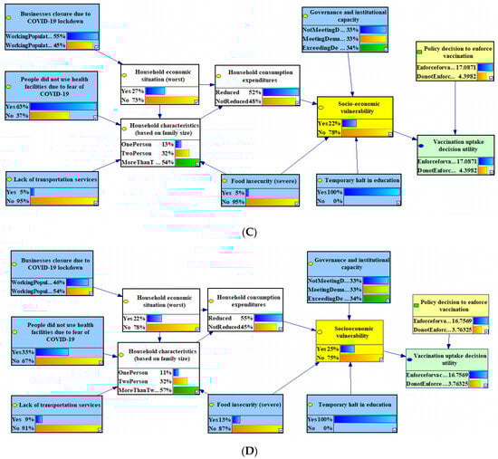 The BID model’s outcomes regarding socio-economic vulnerability in four provinces of Pakistan (Punjab, Sindh, KPK, Balochistan) are depicted in Figure 3A–D, encompassing ten contextual risk factors. Among the identified factors, three stand out as particularly crucial: “Businesses closure due to COVID-19 lockdown”, “No use of health facilities due to fear of COVID-19”, and “Lack of transportation services”. Moreover, the results underscore the significance of household economic situations and characteristics. Both of these factors directly influence household consumption expenditure, serving as direct contributors to socio-economic vulnerability. Consequently, they also indirectly affect the decision utility associated with vaccination uptake. Further insights from the results highlight that factors such as “Food insecurity”, “Temporary halt in education”, and “Governance and institutional capacity” indirectly impact vaccination uptake decision utility through their contributions to socio-economic vulnerability.