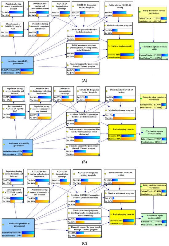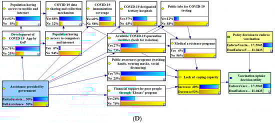 The BID model’s insights into the lack of coping capacity in four provinces of Pakistan (Punjab, Sindh, KPK, and Balochistan) are visually represented in Figure 4A–D. The results illuminate the intricate causal relationships among 12 risk factors, emphasizing the pivotal role of governmental coping capacity in shaping decisions related to COVID-19 vaccination uptake. The analysis reveals that government assistance, highlighted as a parent node, indirectly affects vaccination uptake decision utility through the lens of coping capacity. The government’s development of a COVID-19 app is crucial, influencing the population’s access to computers, the internet, and mobile phones. These, in turn, directly affect the COVID-19 data sharing and collection mechanism, indirectly impacting vaccination uptake utility through coping capacity constraints.