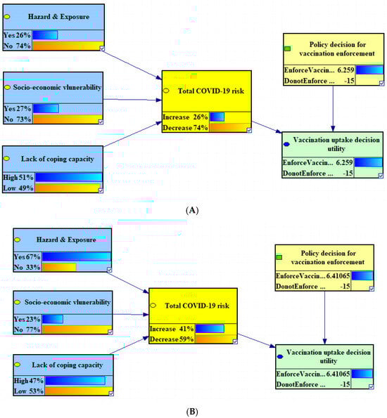 As shown in Figure 5, the values for risk dimensions and total risk were derived from conditional probability tables by assessing the impact of associated factors on the likelihood and severity of risks. Through propagating these probabilities, risk values ranging from 0 to 100 were calculated, with each percentage reflecting the degree of risk associated with specific dimensions or the overall risk. These values serve as baselines, representing the initial assessment of risk based on factors such as hazard exposure, socio-economic vulnerability, and lack of coping capacity. The results of total COVID-19 risk underscore the prominence of two major risk components: hazards and exposure and lack of coping capacity, which substantially influence decision-making regarding COVID-19 vaccination uptake. While socio-economic vulnerability also contributes to shaping vaccination decisions, its impact is comparatively lower than that of the other two risk dimensions. This nuanced understanding of the various risk components is pivotal for policymakers aiming to devise targeted strategies to address the multifaceted challenges posed by the pandemic effectively.