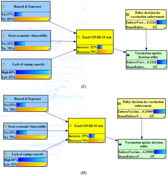 Figure 5. (A) Total COVID-19 risk BID for Punjab province, (B) total COVID-19 risk BID for Sindh province, (C) total COVID-19 risk BID for KPK province, and (D) total COVID-19 risk BID for Balochistan province. Input nodes are colored blue, output nodes are highlighted in yellow, and intermediate nodes are highlighted in white. Light green represents the utility node, and light yellow indicates the decision node. This color scheme is followed in all simulated figures of this work.
