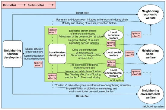 The impact and spatial spillover mechanism of tourism development on urban welfare. Note: The green background represents the local system, the light blue background represents the neighboring system, and the pink background represents spillover effects.