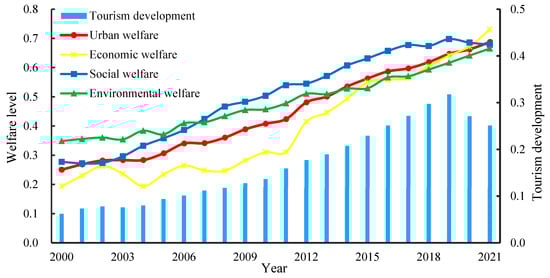 As a manifestation of happiness, benefit, and well-being, welfare is an important symbol of a civilization’s progress and modernization [1]. With the passage of time, people have gradually realized that the ultimate objective of social and economic development is not the expansion of production scale or the growth of gross product but rather the improvement of the level of people’s welfare. The report of the twentieth CPC National Congress emphasized the necessity of upholding and enhancing people’s welfare throughout the development process. With the purpose of creating pleasant experiences and good memories [2], the tourism industry is characterized by high input–output efficiency, low employment thresholds, ecological friendliness, and strong driving force [3,4], which is recognized as an emerging sunrise industry in the new era aiming to meet residents’ material and spiritual needs while enhancing people’s well-being [5,6]. In 2013, President Xi Jinping highlighted that tourism is an important indicator of the improvement of people’s living standards. In 2016, Premier Li Keqiang put forth that tourism, culture, sports, health, and pension constitute the five happiness industries. Moreover, in 2018, the National Tourism Work Conference elevated tourism to the status of the “leading industry” among the five happiness industries. Within the context of constructing a modern and high-level welfare state, China’s tourism industry bears a special significance and mission. However, in practical terms, the welfare effects of the tourism industry are frequently called into question. The agglomeration of the tourism industry has led to a series of issues, including rising prices, traffic congestion, frequent conflicts, and the marginalization of local residents in destinations, which have been subject to repeated criticism [7]. In the face of controversy, only through a scientific understanding of the impact of tourism development on urban welfare can we clear up doubts and implement precise measures to fully release the industrial value of tourism to promote the goal of a “Happy China”.