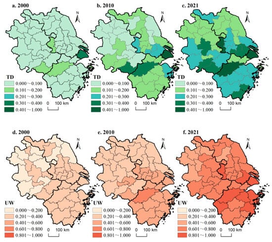 The TD and UW levels in the Yangtze River Delta region were categorized into five levels: high, relatively high, medium, relatively low, and low. The spatial visualization of three cross-sections for the years 2000, 2010, and 2021 was conducted using ArcGIS 10.7 software (Figure 3).