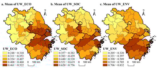 According to Figure 3d–f, in the year 2000, the UW level of cities in the YRD region was predominantly low and relatively low, accounting for 29.27% and 70.73%, respectively. By 2010, there was a significant improvement in the overall UW level of the region, with 48.78% of cities reaching a medium or higher level. Notably, Hangzhou city stood out with the most prominent index.