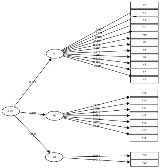 This paper employed the following two levels of measurement to assess the safety climate of the company being analyzed: the organizational level and the fleet level. The statistical analysis of the test results revealed that the Cronbach’s alpha coefficients for both the organizational-level and fleet-level scales were above 0.8, indicating that the scale content exhibited an acceptable level of reliability. The statistical analysis of the results demonstrated that the KMO values of both the organizational-level and fleet-level scales were above 0.6. Additionally, the significance probability value of the Bartlett test of sphericity, p = 0.000 < 0.05, indicated that the data exhibited a high degree of correlation and that their variables were suitable for factor analysis. The principal component analysis yielded three factors with eigenvalues greater than one, which were subsequently designated as principal factors at the organizational and fleet levels. At the organizational level, these factors were identified as safety management, safety supervision, and driver safety priority. At the fleet level, the factors were designated as proactive communication, safety group awareness, and self-restraint. The cumulative variances of all extracted factors were greater than 60%, thereby demonstrating the reliability of the extracted factors. The structure of the measurement models and the standardized path coefficients were subjected to validation factor analysis. The fit results of both measurement models for the OSC and FSC were deemed to be acceptable, with all indicators meeting the requisite criteria.
