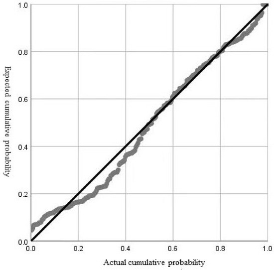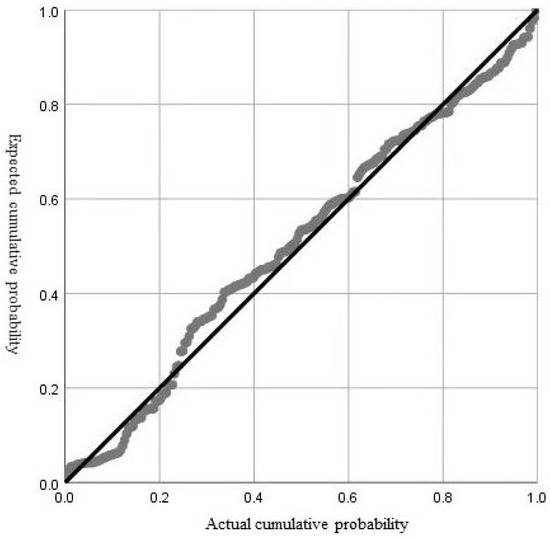 For the purpose of predicting the volume of accidents involving drivers who have driven for 1000 km, the results indicated that the organizational- and fleet-level safety climate scores significantly predicted the number of 1000 km accidents. The first-order coefficient B-values were −0.286 (SE = 0.004, 95% confidence interval = [−0.293,−0.278], p < 0.01) and −0.268 (SE = 0.003, 95% confidence interval = [−0.274,−0.261]), respectively (p < 0.01) (Table 9). As illustrated in Figure 5 and Figure 6, the data points in the organizational-level and fleet-level P-P plots appear to approximate a straight line, suggesting that the data conform to the formulated distribution. The negative B-value indicates that the accident rate is negatively correlated with the safety climate score, indicating that, as the safety climate score increases, the number of accidents decreases.