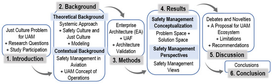 The structure of this article is outlined in Figure 1. The rest of this article is organized as follows. Section 2 describes the theoretical foundations of this study for safety culture, just culture, and modeling. Then, contextual information about safety management in aviation and UAM operations is presented. Section 3 introduces the study method by explaining the need for a systemic approach, describing the enterprise architecture (EA) methodology and the modeling framework used to elaborate the architecture views. Section 4 presents the results of the study. First is the conceptualization process, which includes problem space definition and solution envisioning. Next, architectural views with safety management perspectives and definitions are presented. Section 5 debates the results, reflecting on the literature and proposing a cooperation framework for just culture at the ecosystem level. Limitations and research guidance for future contributions complete the discussion section. Finally, Section 6 contains conclusions.