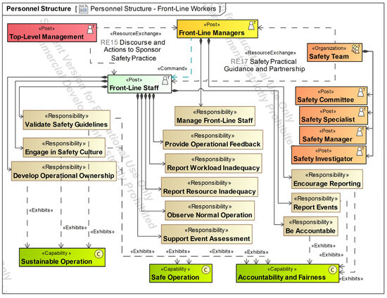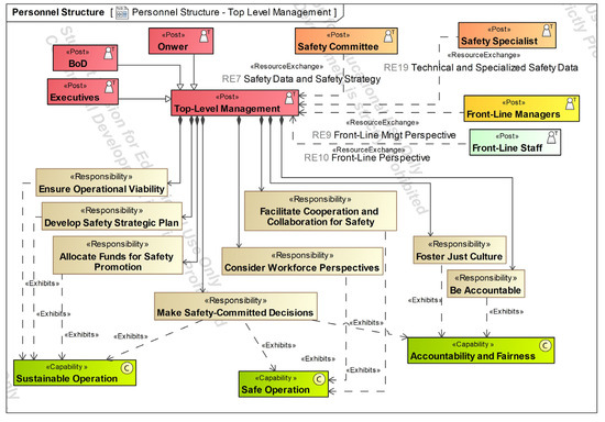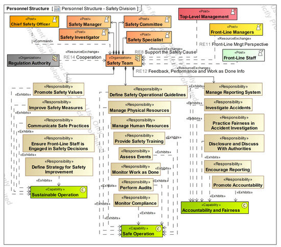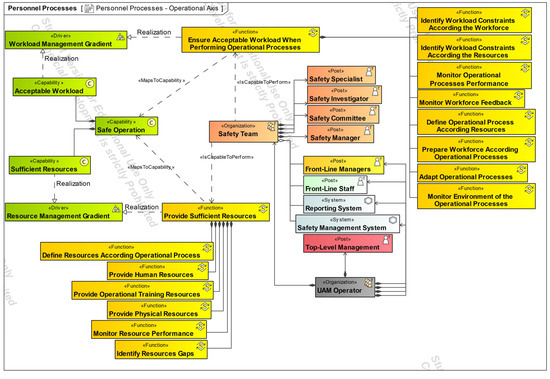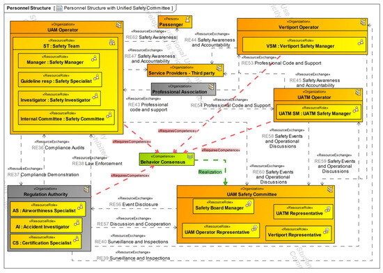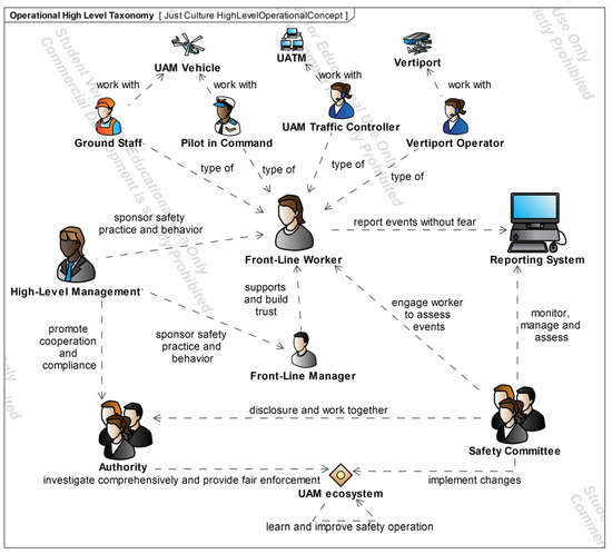 The diagrams presented in the following sections used UAF version 1.2 [55]. The authors created all the diagrams in this article based on the safety management and just culture theoretical foundations presented in Section 2.2. High-level operational concepts were extracted from existing UAM ConOps [8].