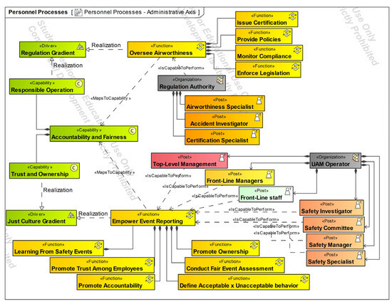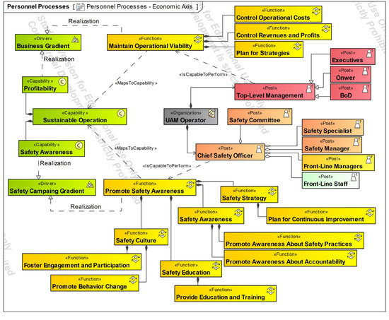 With respect to the modeling effort, the authors performed a consistency check and semantic analysis considering the elaboration process and modeling framework [54]. Although not all views, model aspects, and elements are presented in this work due to space limitations, the enterprise motivation and strategy were defined according to UAM just culture goals. From the defined goals (mission and values), the strategic capabilities are then defined and associated with goals. The strategic capabilities are the base for defining functional architecture, resource architecture, and personnel structure. More explanations of the elements and the development of the architecture are described in the following section. Thus, verification and validation were conducted through a set of analysis activities including element associations, tracing, and coverage after multiple iterations and corrections. Language verification was also performed to check the semantics.