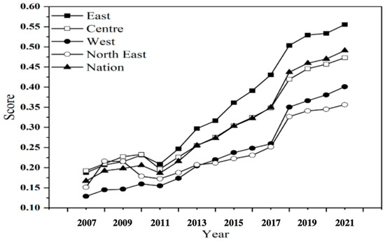 Significantly, the Eastern region has maintained a leading position in digital climate governance capacity since the onset, with its advantage becoming markedly more pronounced since 2011. This period marked a rapid ascent in digital climate governance across all regions, with the Eastern region not only achieving the fastest growth but also setting the benchmark in climate governance capacity. The digital governance growth in the Eastern region escalated from a modest 0.1874 in 2007 to an impressive 0.5554 in 2021. The average annual growth rate in this region was 0.53% up to 2011, surging to 3.47% thereafter. These findings align with the existing literature, highlighting the Eastern region’s superior infrastructure development and digitalization efforts. Interestingly, the Central region exhibited relative advantages until 2011 at 0.1965, possibly due to its resource reserves and industrial base, which facilitated digital infrastructure development by absorbing industrial transfers from the East [44]. Meanwhile, the Northeast region experienced a brief period of dominance around 2008 at 0.2163, but its development pace has slowed significantly since 2010 at 0.1785, trailing behind other regions (0.2312, East; 0.2328, Central).