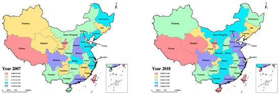 Figure 3 charts the evolution of China’s Digital Climate Governance Capability Scores between 2007 and 2018, with subfigures describing provincial scores for each of these years. This period witnessed a general enhancement in carbon neutrality scores across most provinces, with the Eastern region maintaining a distinct lead. Notably, the Guangdong province, which held the highest score in 2007 at 0.2106, impressively advanced to 0.7251 by 2018. Jiangsu, Beijing, and Zhejiang have similarly demonstrated substantial growth potential in digital climate governance. This is closely related to the solid economic development foundation and varying developmental stages across different regions. Provinces along the southeastern coast, such as Guangdong and Zhejiang, were among the first in China to open up to foreign investment. They have achieved high-quality economic development and possess robust industrial foundations. Moreover, they are at the forefront of industrial transformation and have accumulated rich experience in utilizing digital technologies to achieve green development. These factors lay a solid foundation for advanced levels of digital climate governance capabilities [45]. In the Central region, Hubei emerged as the province with the foremost governance capacity. The correlation between these scores and the robust economic and industrial infrastructure of the developed Eastern and Central provinces is stark. A strong economy underpins the deployment of innovative technologies and digital transformation facilities critical for advancing digital climate governance [46]. Meanwhile, Sichuan stands out in the Western region due to its consistently high scores, though other provinces in this area lag. As Sichuan Province serves as the central hub for development in the Western region and a vital gateway for external trade and communication, it holds significant importance in the advancement of digital climate governance. Moreover, the province boasts abundant technical resources, including numerous universities and research institutes. These factors play a pivotal role in enhancing its digital climate governance capabilities [6]. The Northeast, despite its solid industrial foundation, faces challenges in timely industrial structural transformation and upgrading, marking a pivotal phase for its industrial evolution. Consequently, its digital climate governance scores remain comparatively low.