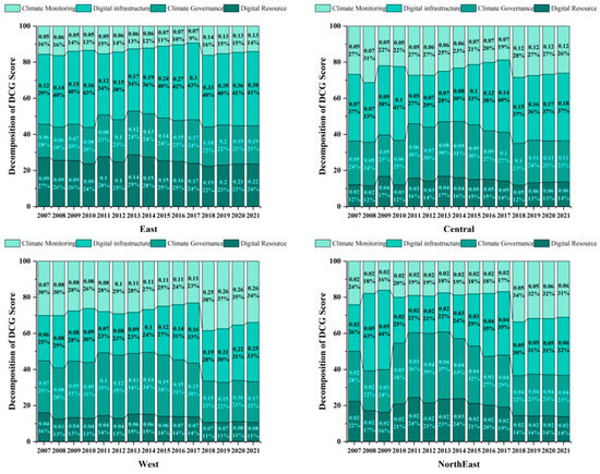 This study employs a regional differences decomposition method to dissect the digital climate governance capacity scores by region, as visualized in Figure 4. The decomposition analysis, with the Eastern and Central regions featured in the first row and the Western and Northeastern regions in the second, highlights stark contrasts in their digitalization progress. The Eastern region, with its forefront position in digital infrastructure development, not only continues to bolster its lead but also contributes significantly, accounting for 41% of its digital climate governance capacity in 2021. This finding aligns with expectations and underscores the Eastern region’s robust foundation in industrial and digital technology development, propelling it ahead. Achieving commendable strides in digital transformation across various sectors, the Eastern region necessitates further bolstering through policy and market support. Such strategic support is pivotal for sustaining its advantage, paving the way for pioneering advancements in digital climate governance methodologies and technologies and amplifying the national digital climate governance level by setting a precedent for other regions to follow.