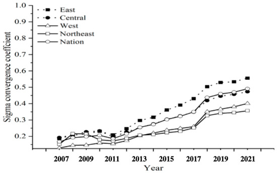 The coefficients of the responses in Figure 5 indicate whether there is convergence in the digital climate governance capacities of the regions. Overall, there is no convergence in digital climate governance capacity. The Sigma convergence coefficient increases from 0.1653 in 2007 to 0.4554 in 2021, which indicates a further widening of the overall differences, consistent with the findings above. From the perspective of each region, the Sigma convergence reflects to some extent the findings of the Gini coefficient within the region, with the Sigma coefficient showing an increasing trend of upward fluctuation in the Eastern and Western regions, which have a more dispersed distribution of digital climate governance capacity. In contrast, the Central and Northeastern regions have significantly lower growth rates than the Eastern and Western regions, although the coefficients also show an increasing trend. The above data indicate that the digital climate governance capacity does not meet the conditions of Sigma convergence, and the gap in digital climate governance capacity between regions still exists, which is consistent with the results of the Dagum−Gini coefficient method.