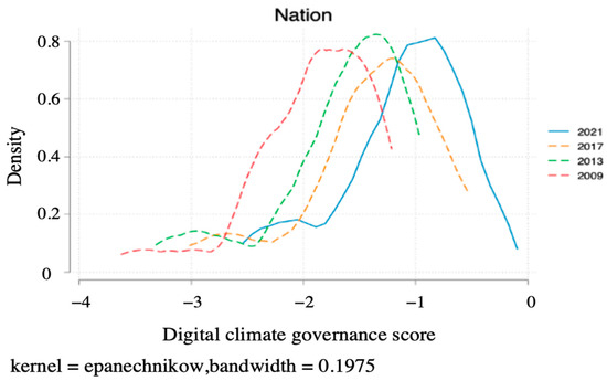 In this study, the kernel density estimation method is used to further explore the time−space evolution characteristics of digital climate governance capacity. As shown in Figure 6, starting from the center of the density curve, the center of the digital climate governance capacity scores moves to the right continuously. Therefore, the digital climate governance capacity of the provinces is increasing and improving. The process of digital climate governance may be closely related to the development of digital technology and the upgrading of infrastructure configuration. However, there is still much room for digital climate governance in China, which means that the process of digitizing climate governance should be further deepened.