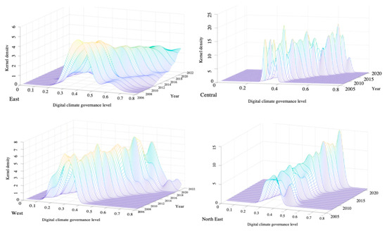 Figure 9 illustrates the distribution dynamics of the coupled coordination levels of the four regions. First of all, in terms of the distribution position, the center of gravity of the distribution of the four major regions has moved to the right, which indicates that the level of coordination between the digital climate governance capacity and the economic and social development of each region has increased and evolved at a faster pace. Regarding the characteristics of regional peaks, a fluctuating upward trend is observable in all areas except the Eastern region. Notably, the Northeastern region shows a significant rise in peak levels alongside a narrowing of peak widths, transitioning from broad to sharp peaks. This pattern indicates a reduction in the disparity of coordinated development within the region. Conversely, in the Eastern region, the widening of peak widths coupled with a gradual decline in peak values signifies a downturn in coordinated development capacity and an expansion in intra-regional disparities. This trend in the Eastern region may be attributed to its rapid economic growth and swift industrial evolution [49]. Despite advancing digital climate governance, it struggles to match the pace of economic development, contrasting with other regions where economic and digital climate governance capacities develop more harmoniously.