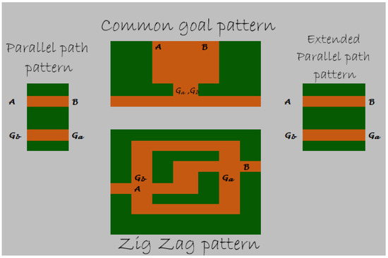 Out of many potential interference layouts used in our experiments, for now, we consider four coordination patterns to express our idea: the ’parallel path pattern’, the ’extended parallel path pattern’, the ’common goal pattern’, and the ’zigzag pattern’ (Figure 2). Here, A and B indicate the current locations of the two agents, and and show their goal locations.