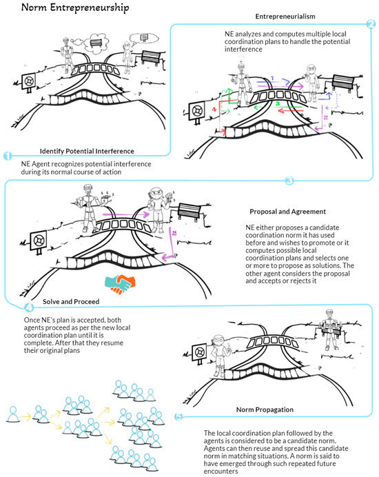 - Anavankot, A.M.; Cranefield, S.; Savarimuthu, B.T.R. Towards Norm Entrepreneurship in Agent Societies. In International Conference on Practical Applications of Agents and Multi-Agent Systems; Springer: Berlin/Heidelberg, Germany, 2023. [Google Scholar] [CrossRef]