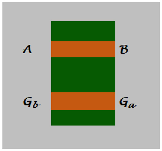 The parallel path pattern. Green cells represent lawn areas, brown cells represent pathways, and grey cells represent open spaces. A and B indicate the current locations of the two agents, and and show their goal locations.