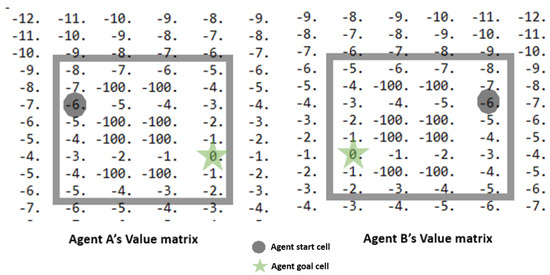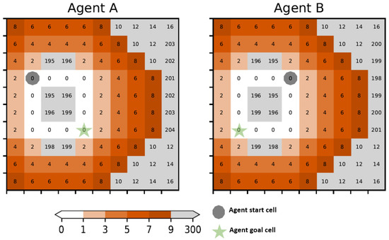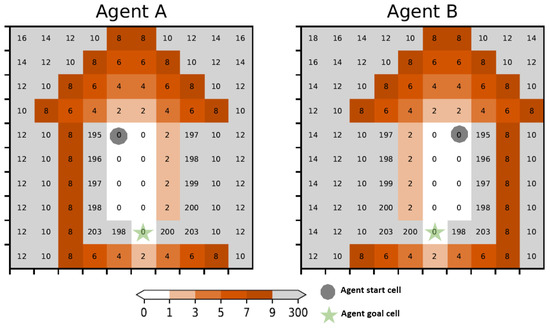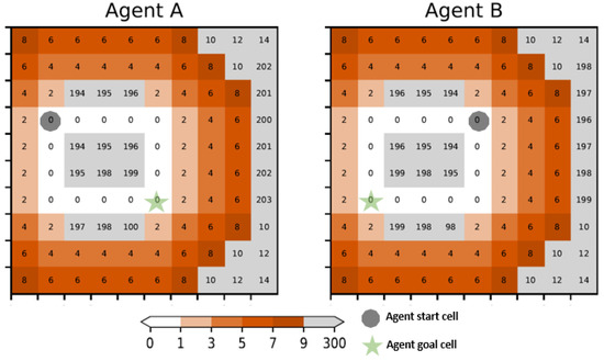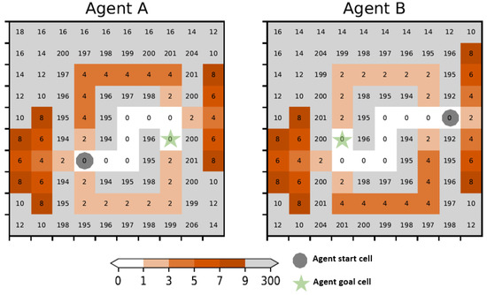 The figure on the left of Figure 5 illustrates the values assigned to each cell for agent A, while the right side illustrates those for agent B. The circle represents the start cells and the thin-edged stars represent the goals.