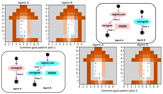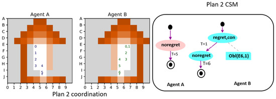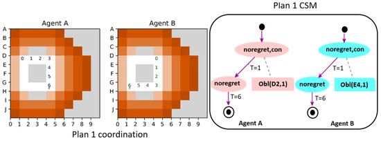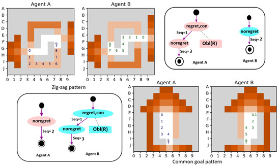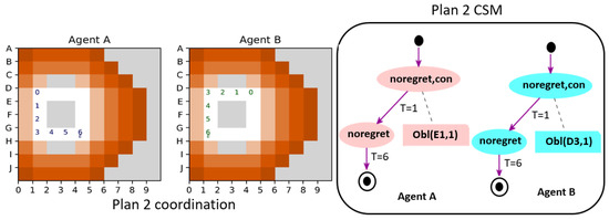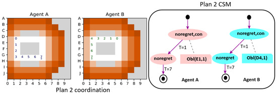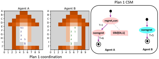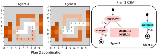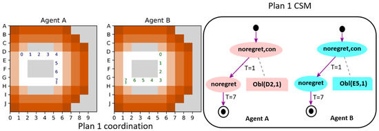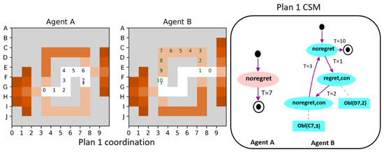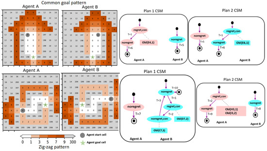Coordination state machines for the common goal and zigzag pattern. The figure shows the cross-scenario CSM of agents A and B. The higher the saturation of a colour in the regret landscapes, the higher the regret. The plans are superimposed on their respective regret landscapes. “0” refers to the starting point of the agent. The numbers refer to the steps the agent takes to reach its goal, and the numbers with a subscript “E” refer to the goal. The circle represents the agent’s start cell and the star represents the agent’s goal cell.
