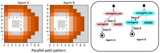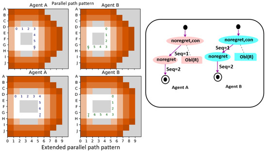 Extended parallel path cross-scenario CSM. The figure shows the cross-scenario CSM of agents A and B for the extended parallel path pattern. The higher the saturation of a colour in the regret landscapes, the higher the regret. The plans are superimposed on their respective regret landscapes. “0” refers to the starting point of the agent. The numbers refer to the steps the agent takes to reach its goal, and the numbers with a subscript “E” refer to the goal. The set of transitions Seq = 1, Seq = 2, …, Seq = n represents the state change sequence.