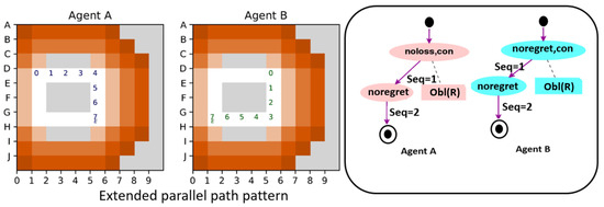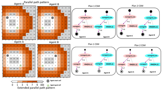 Coordination state machines for the parallel path pattern and extended parallel path pattern. The figure shows the cross-scenario CSM of agents A and B. The higher the saturation of a colour in the regret landscapes, the higher the regret. The plans are superimposed on their respective regret landscapes. “0” refers to the starting point of the agent. The numbers refer to the steps the agent takes to reach its goal, and the numbers with a subscript “E” refer to the goal. The circle represents the agent’s start cell and the star represents the agent’s goal cell.