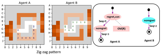 Zigzag pattern cross-scenario CSM. The figure shows the cross-scenario CSM of agents A and B for the zig-zag pattern. The higher the saturation of a colour in the regret landscapes, the higher the regret. The plans are superimposed on their respective regret landscapes. “0” refers to the starting point of the agent. The numbers refer to the steps the agent takes to reach its goal, and the numbers with a subscript “E” refer to the goal. The set of transitions Seq = 1, Seq = 2, …, Seq = n represents the state change sequence.