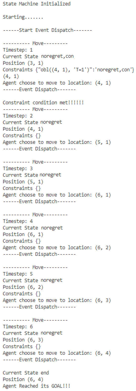 - Timestep 6: The agent is still in the state ’noregret’ at position (6, 3). No constraints are present. The agent chooses to move to position (6, 4), successfully reaching its goal.
