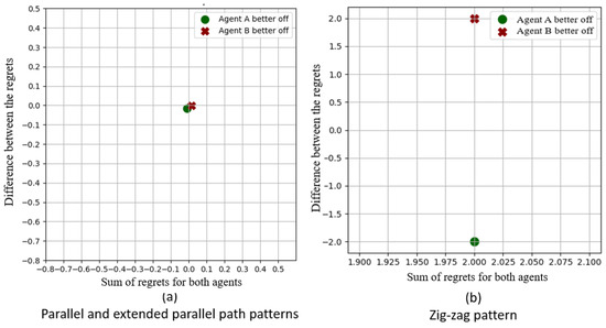 Category 1 depicted in Figure 23 illustrates scenarios where there are only two solutions available. Figure 23a depicts cases where both agents incur no regret. For example, in the parallel path pattern and the extended parallel path pattern in Figure 2, both the agents incur no regret following either of the plans. This happens when agents have more than one optimal plan and they have to refrain from crossing paths. Figure 23b pertains to scenarios where two solutions exist: one where agent A benefits more and another where agent B does. The points are jittered to illustrate two distinct plans.