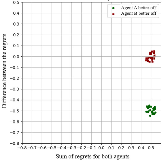 Regret for agents A and B across LCPs—two solution category (the points are jittered to allow them all to be seen). We use green to denote situations where agent A experiences the least regret and red where agent B experiences the least regret.
