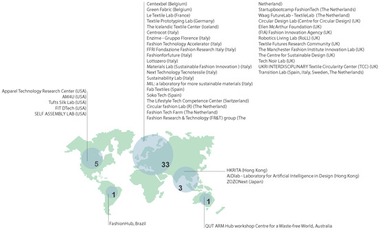 For this study, we have identified 43 research centers demonstrating engagement with sustainable or technological knowledge in fashion situated across 15 countries all around the world (Figure 1, Appendix A). The heterogeneous typology of mapped initiatives from university research labs to competence centers allows for a comparison of similarities and differences that have been analyzed in terms of low-level codes (specific innovations and initiatives of each case) and higher-level codes (initiative nature, typology of conducted research, laboratory model, scale, partnerships, disciplinary fields) (for details, refer to Bocken et al. [41] and Appendix A).