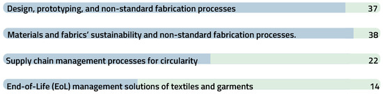 The compared initiatives exhibit a diverse composition in their vocation, encompassing fashion, clothing, and textiles, but have in common that they are actively working to enhance responsibility through technology support or adoption. Their efforts extend beyond the design phase, encompassing business management and technological aspects. The analysis of the cases allowed us to understand the main research areas of those research entities, therefore understanding the significant topics of interest for fashion companies. Based on the recurrence of these topics, we were able to categorize four main research areas (Figure 2):