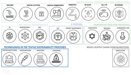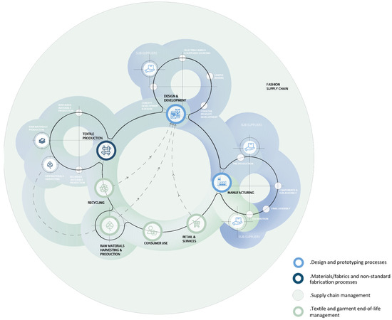 The expected paradigmatic change demands more systemic approaches to transforming the fashion, textile, and clothing industries. The current trend of circularity and sustainable development, as outlined by Sterling [49], calls for a change from homogeneous systems of “doing better things” to holistic systems of “doing things better” to establish a sustainable paradigm. The combination of numerous supporting and core technologies is required for this I4.0 shift.