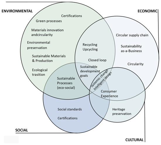 At the intersection of environment and society, some initiatives invest in processes preserving ecologies and societies via sustainable technologies impacting manufacturing for both people and planet preservation [37]. In the overlap of environment and economy, practices related to recycling, upcycling, and closed-loop fashion supply chains address operational and managerial aspects, promoting sustainability [90]. Socio-cultural and economic considerations involve informing consumers about the social and environmental impacts of textiles/clothing, enabling conscientious purchasing decisions [91]. Lastly, the convergence of environmental and socio-economic aspects aims for systemic change and intelligent design, creating a new model that enhances environmental, economic, and social sustainability while promoting responsible design by adopting digital solutions [92].